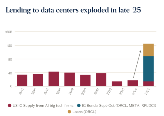 - Credit structures are getting stress-tested. A meaningful portion of 2025 infrastructure expansion was enabled by private credit and off-balance-sheet financing that assumed sustained high utilization and uninterrupted growth. The most visible example was Blue Owl’s $27B private-debt financing for the Hyperion campus, structured off Meta’s balance sheet. While we do not expect a high-profile default in 2026, the conditions that lead to a default begin forming here. The actual risk shows up later, as projects go live and underwriting assumptions collide with real ramp curves.