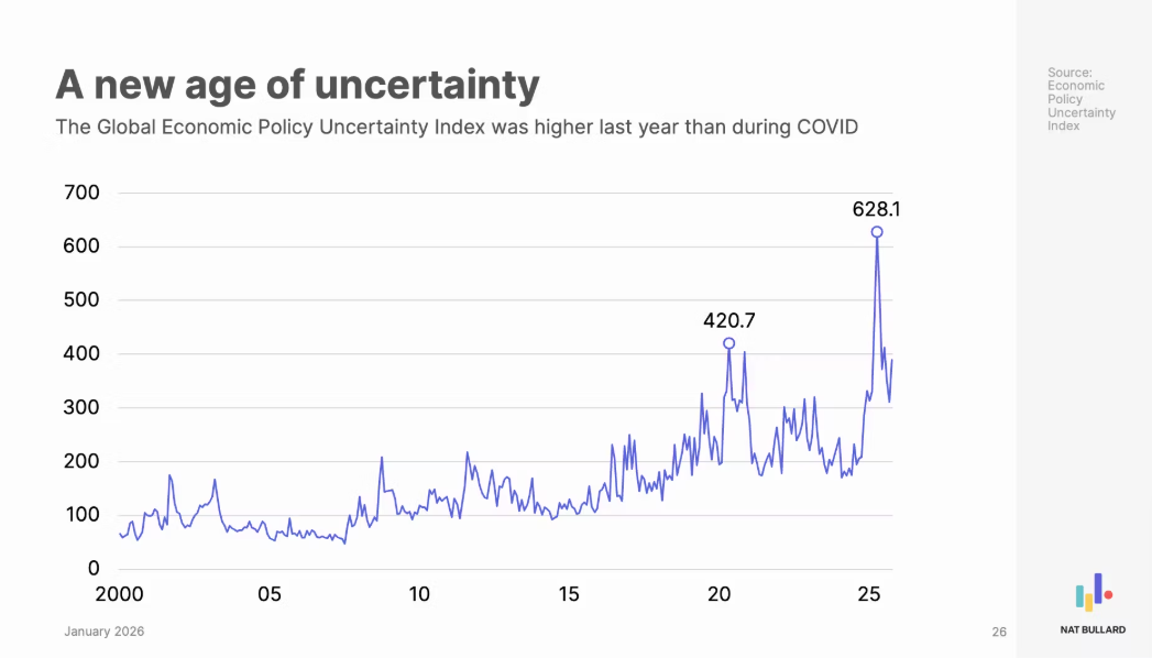 We saw multiple geopolitical crises continue (e.g. Russia / Ukraine) in 2025 and new ones emerge (e.g. US / Venezuela) in early 2026 as well as an all-time high for global economic policy uncertainty as shown in the chart below. And there is no indication that this will let up in 2026. The question is not if there will be more uncertainty, it’s where it’ll come from – which crises can we expect next?