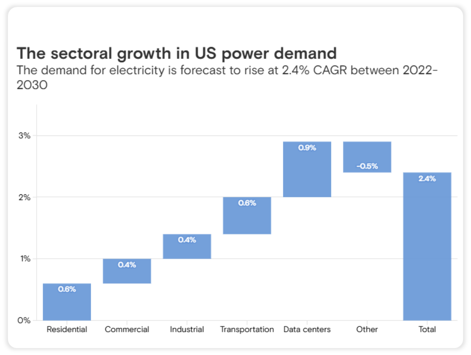 The reason is simple: AI is driving unprecedented electricity demand. The scale of this transformation is difficult to overstate. Data centers consumed about 4.4% of total U.S. electricity in 2023 and are expected to consume approximately 6.7% to 12% of total U.S. electricity by 2028, potentially tripling their share in just five years. Data center electricity use is expected to outpace every other sector, including electrification of transport and onshoring of manufacturing. This projected load growth is especially striking given that demand has been essentially flat for decades.