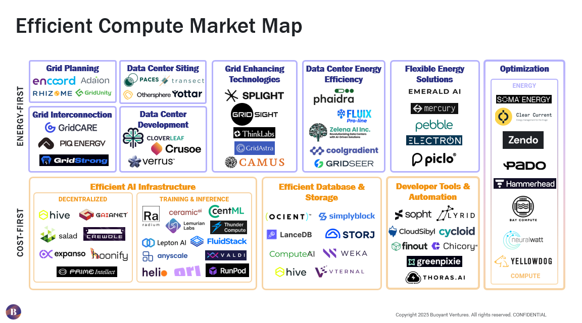 At Buoyant, we see these constraints as opportunity. Our Efficient Compute Market Map below organizes this emerging landscape along two primary axes: